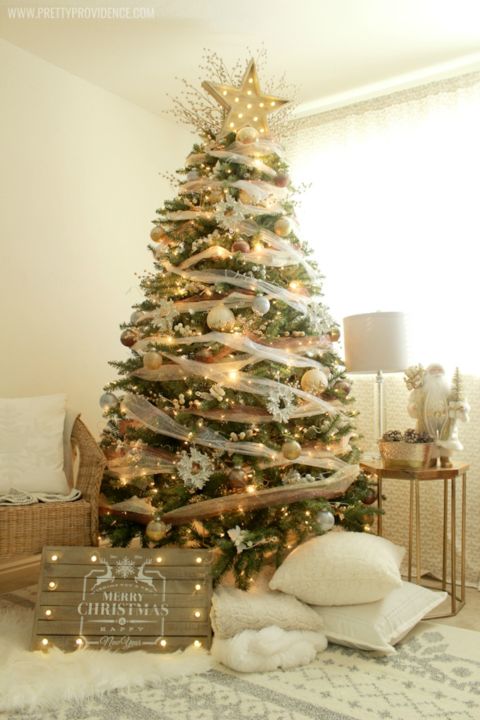 If you can’t get enough of the gold accent trend, give your living room a elegant yet delicate touch for the holidays with this tree.